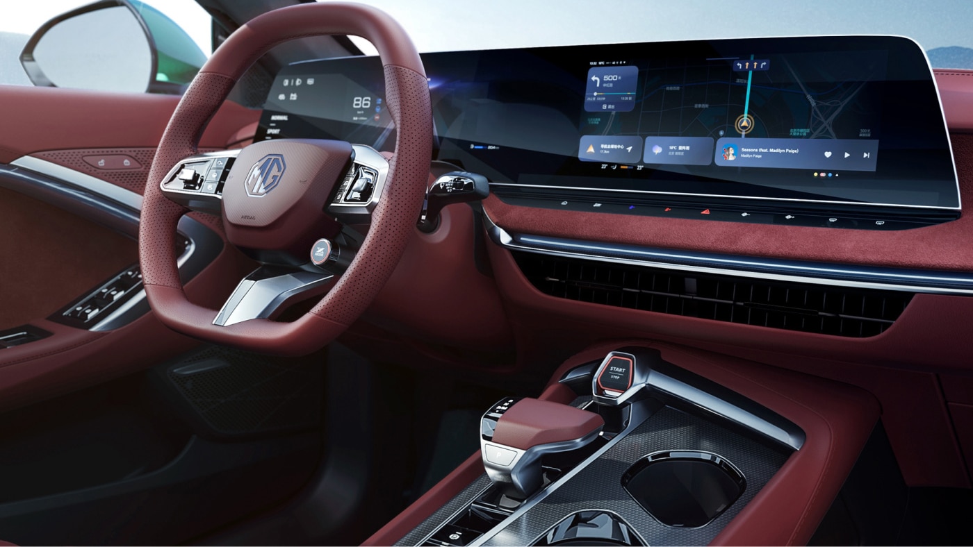 Bên trong nội thất, MG7 tập trung tới sự tối giản khi lược bỏ hầu hết các phím bấm vật lý. Một số nút tắt như tăng/giảm âm lượng, nhiệt độ điều hòa,… được bố trí dạng nút cảm ứng ở dưới mép màn hình. Hai màn hình ở táp-lô có tổng kích thước 39,22 inch (14,1 inch trái, 25,12 inch phải).
